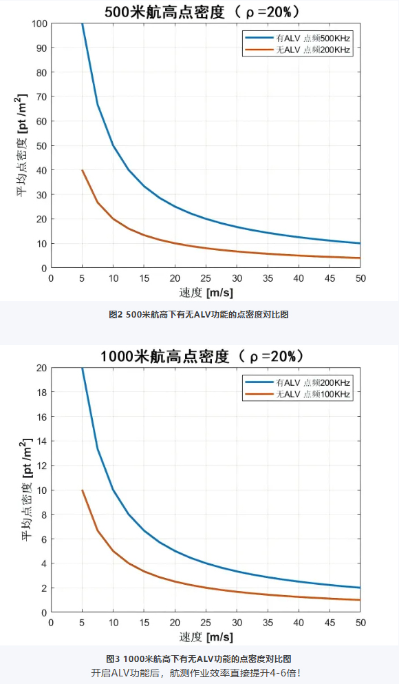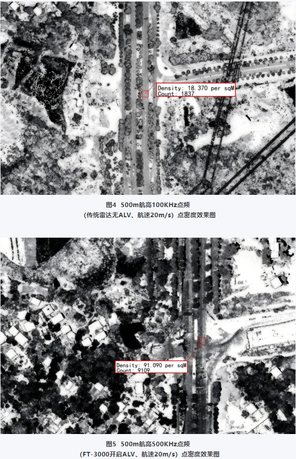 若无ALV功能,FT-3000的测距能力将极大地受到了限制。为了达到较高飞行高度,只能降低激光发射频率,导致无法获取较高点密度的扫描成果。开启ALV功能后,相同航高下,激光发射频率将比无ALV功能提高一倍乃至更多!例如,在500米航高下,开启ALV功能后可以保证激光点频达到500KHz,而无ALV功能下激光点频只能达到200KHz;在1000米航高下,开启ALV功能后可以保证激光点频达到200KHz,而无ALV功能下激光点频只能达到100KHz,如图2、图3所示。